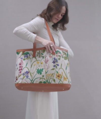 Vesken er dekket av det ikoniske mønsteret «Rose & Lily Nature», designet av Gocken Jobs i 1946. De håndtrykte fargene på naturlig farget belgisk lin gir vesken et mykt og tidløst uttrykk, og hvert eksemplar har sin egen unike plassering av mønsteret.