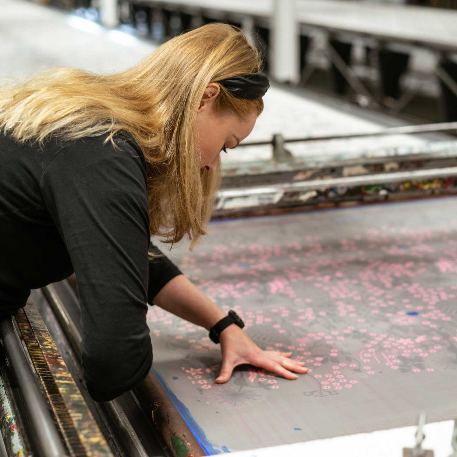 Vi använder vattenbaserade pigmentfärger, noggrant blandade för hand av våra skickliga tryckmästare. Eftersom vår metod inte kräver efterföljande tvätt, sparar vi stora mängder vatten jämfört med konventionella trycktekniker.