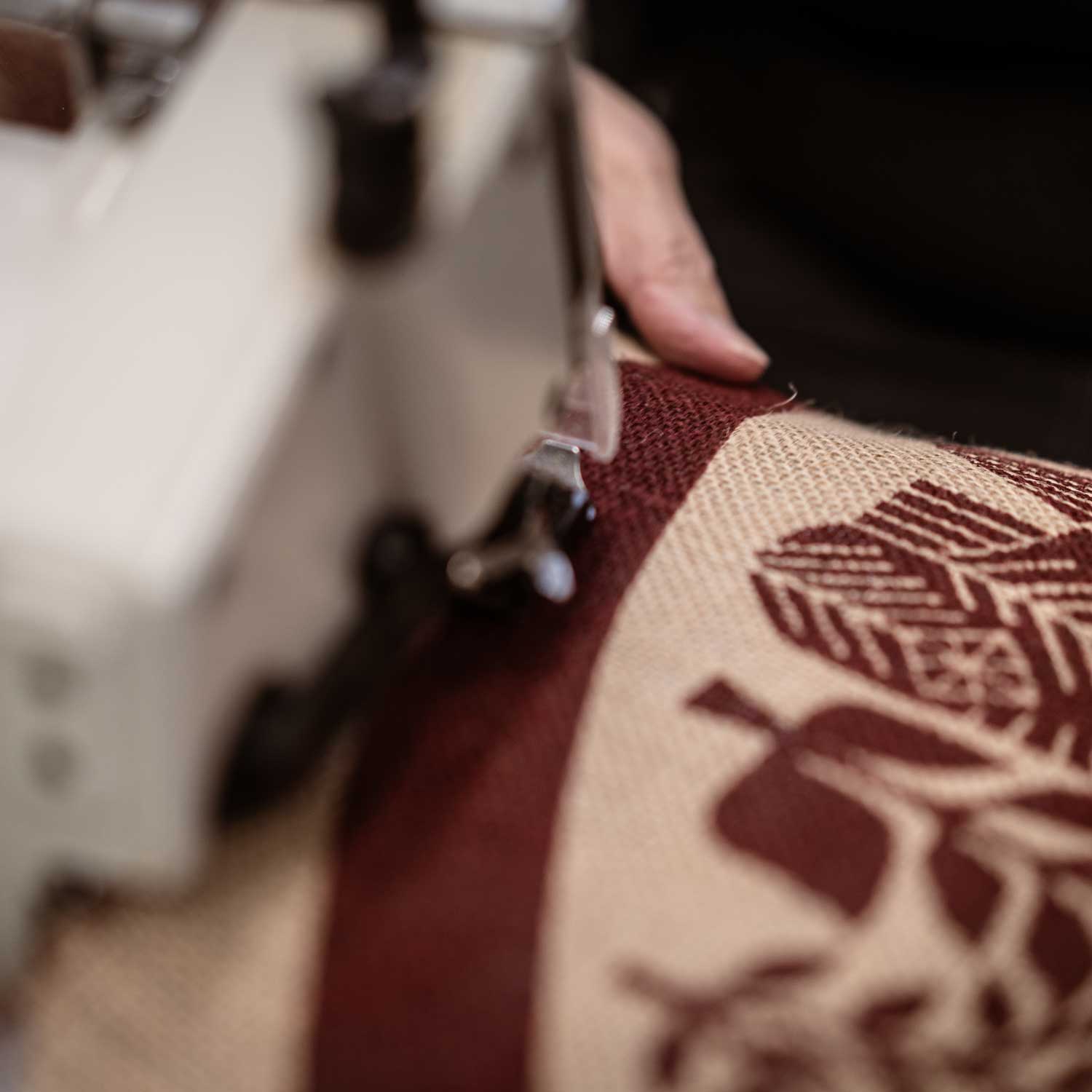 Tygerna till våra produkter handtrycks i Nälden med traditionell screentrycksteknik innan de förvandlas till färdiga textilier i vår egen sömnadsatelje. Här syr vi kuddar, handdukar, löpare, gardiner och andra produkter med stor omsorg och precision.